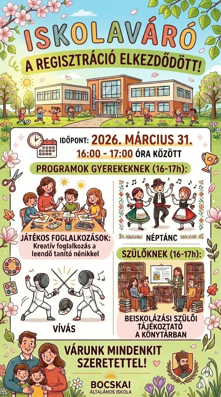 Minden kedves érdeklődőt szeretettel várunk 2026. március 31-én 16-17h között megrendezendő Iskolaváró foglalkozásunkra!