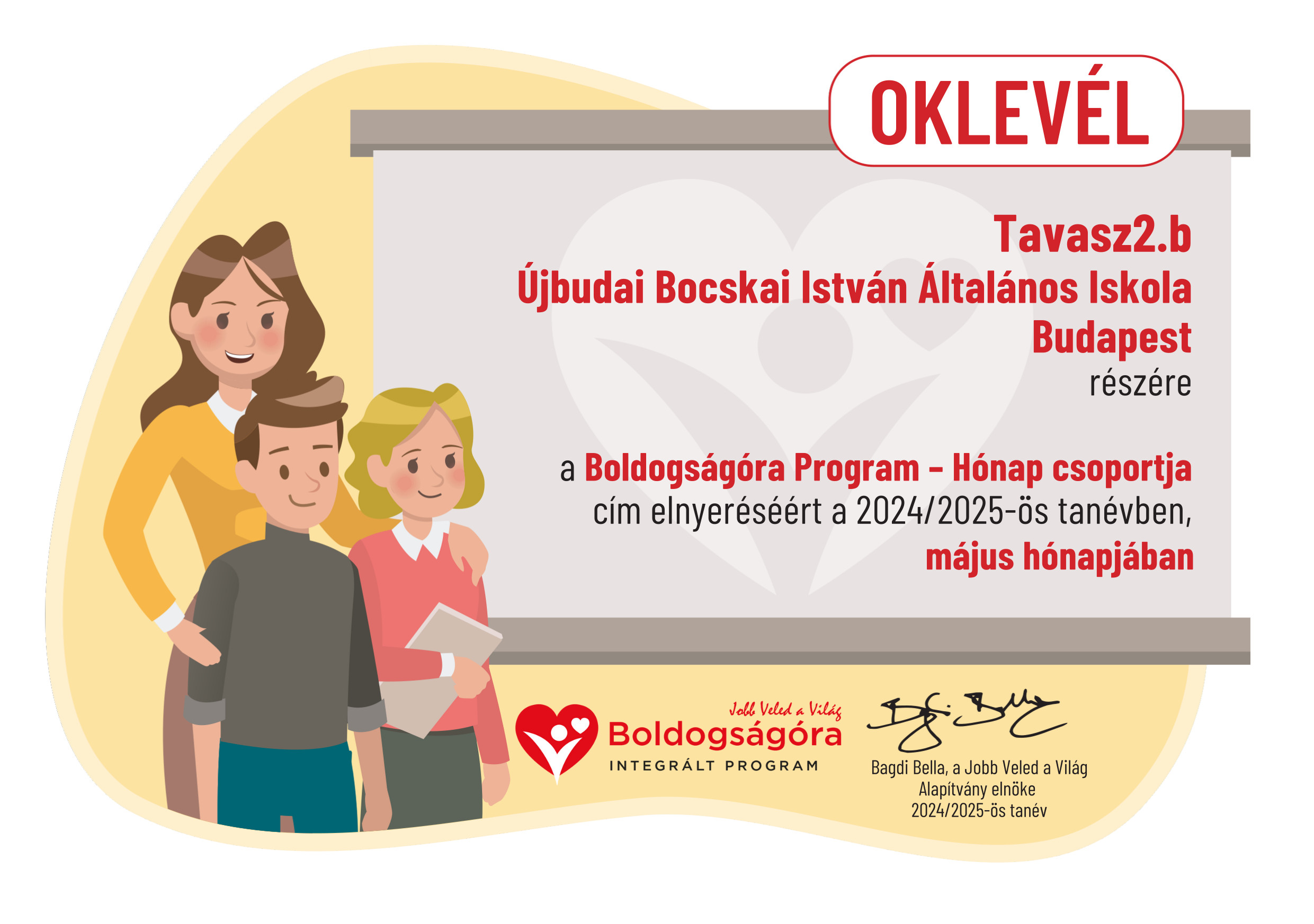 Örömmel tesszük közzé, hogy iskolánk pedagógusa, Vörösné Snóbl Ágnes és a 2.b osztály 2025. májusában a Boldogságóra program keretein belül „A hónap csoportja” elismerésben részesült.