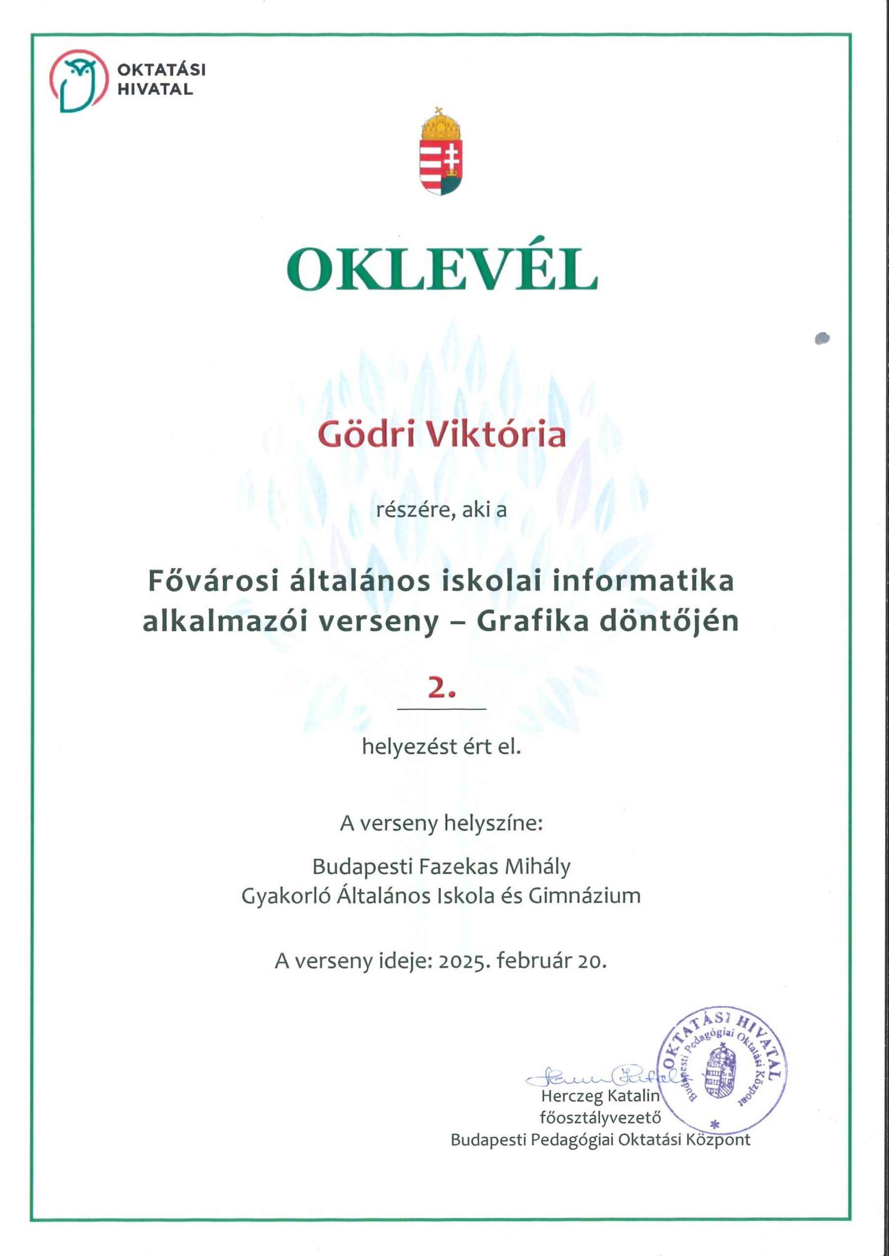 Az I. korcsoport Grafika kategóriában Gödri Viktória (6a) Fővárosi 2. helyezett,
