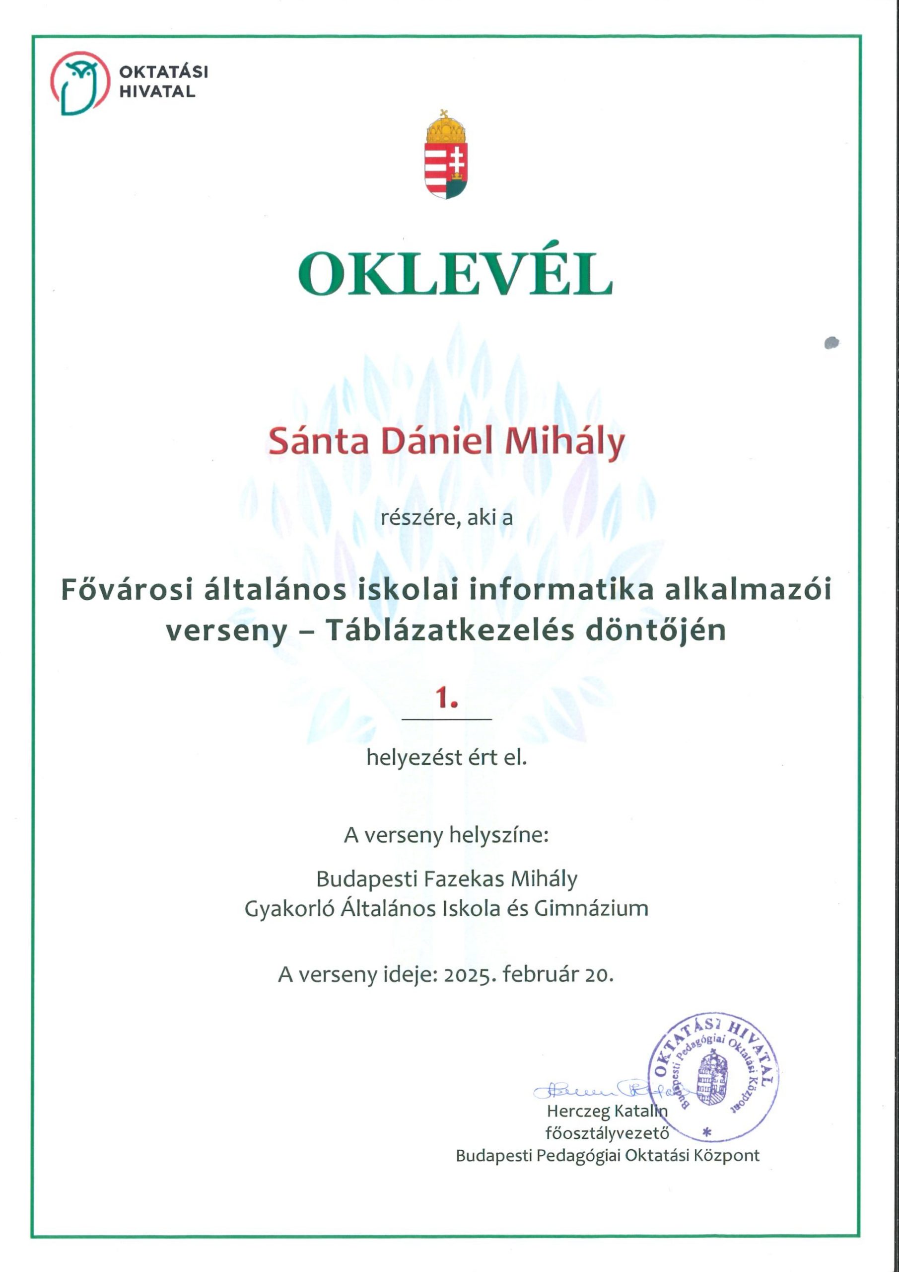 a II. korcsoport Táblázatkezelés kategóriában Sánta Dániel (8b) Fővárosi 1. helyezett lett.